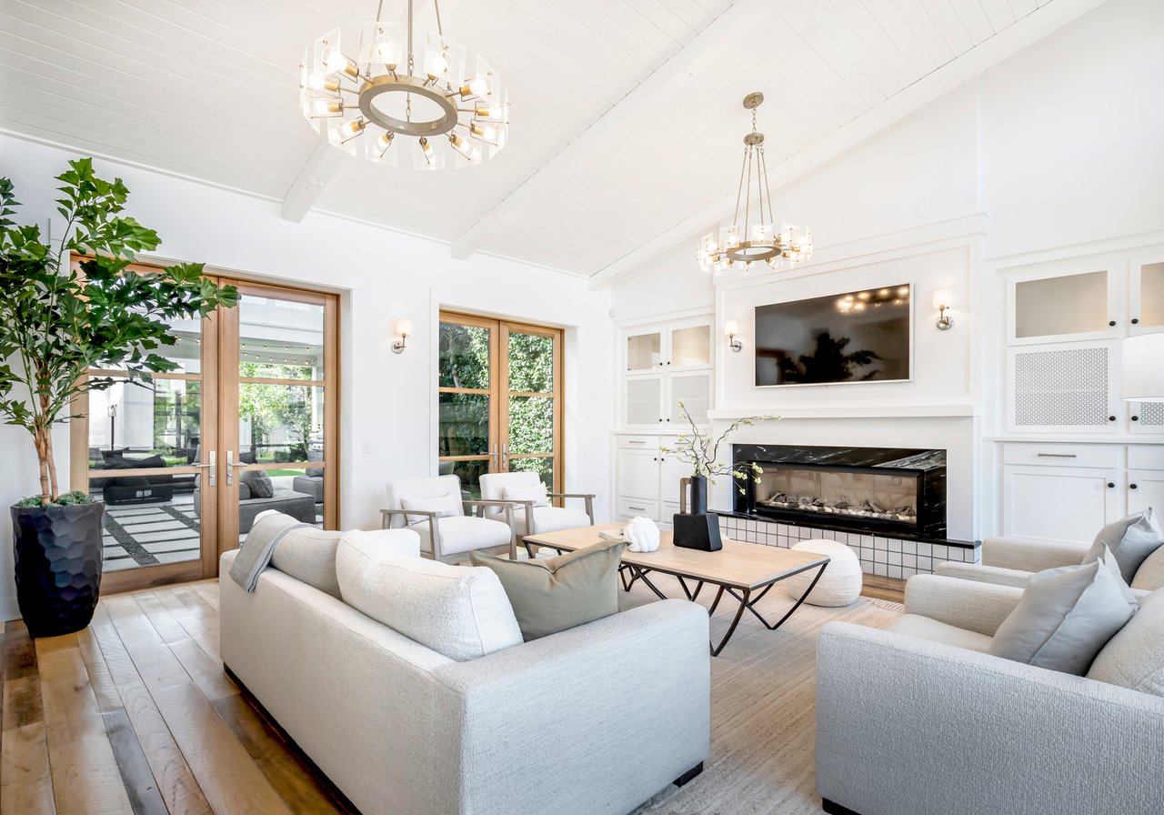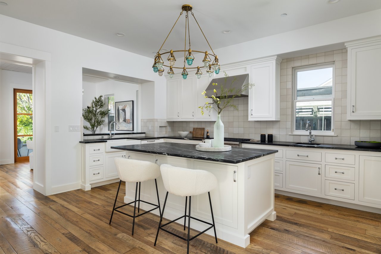 Inside, the vaulted living room makes a statement with tongue-and-groove ceilings, exposed beams, and a central fireplace flanked by inset French doors. Reclaimed wood floors flow through to the dedicated dining space, chef’s kitchen and wrap-around bar all connected by oversized sliding glass pocket doors opening onto the lush, inviting yard.